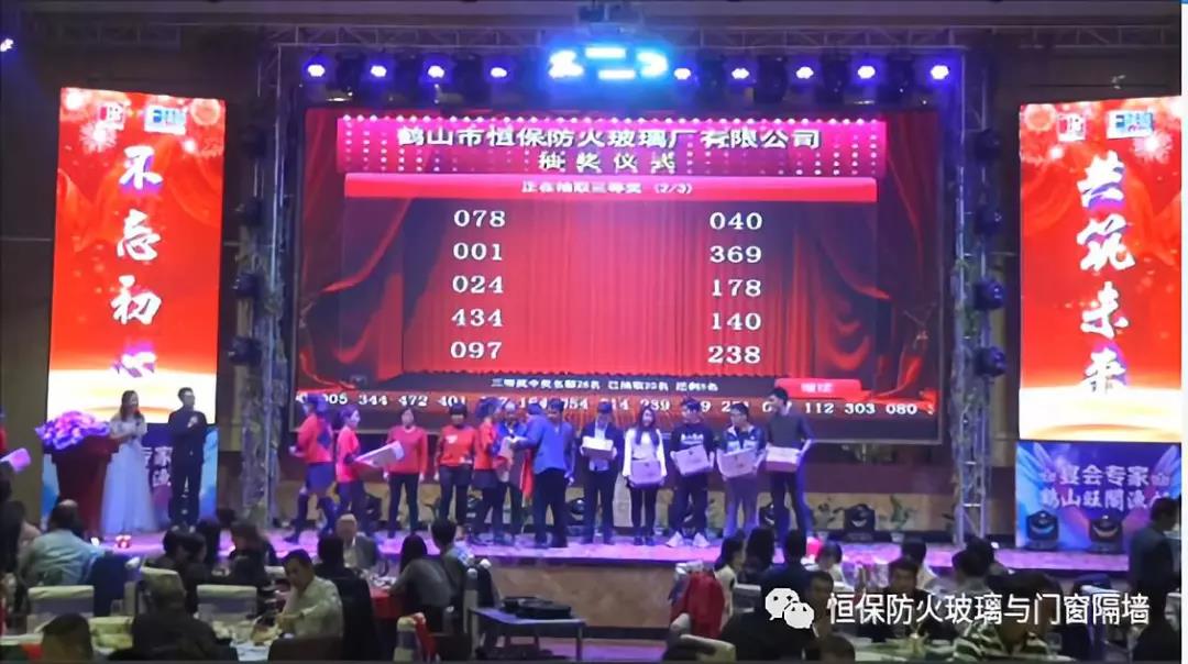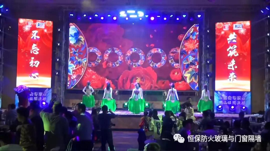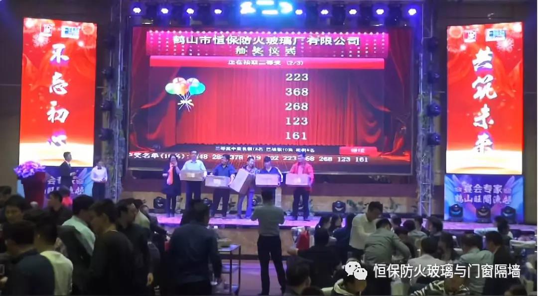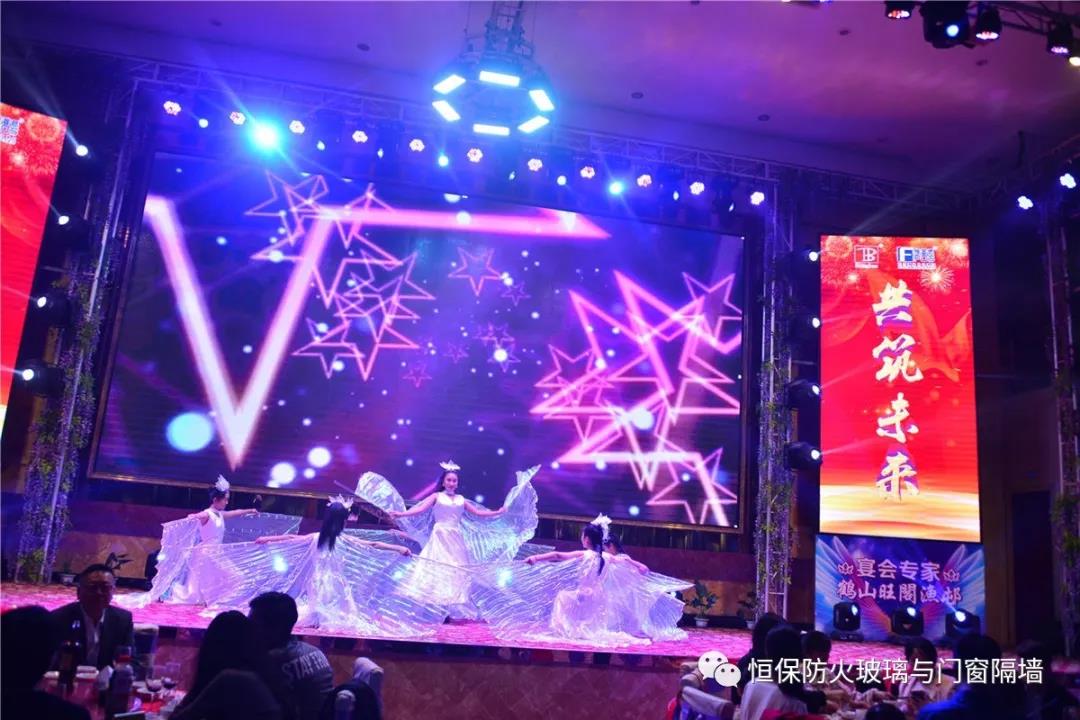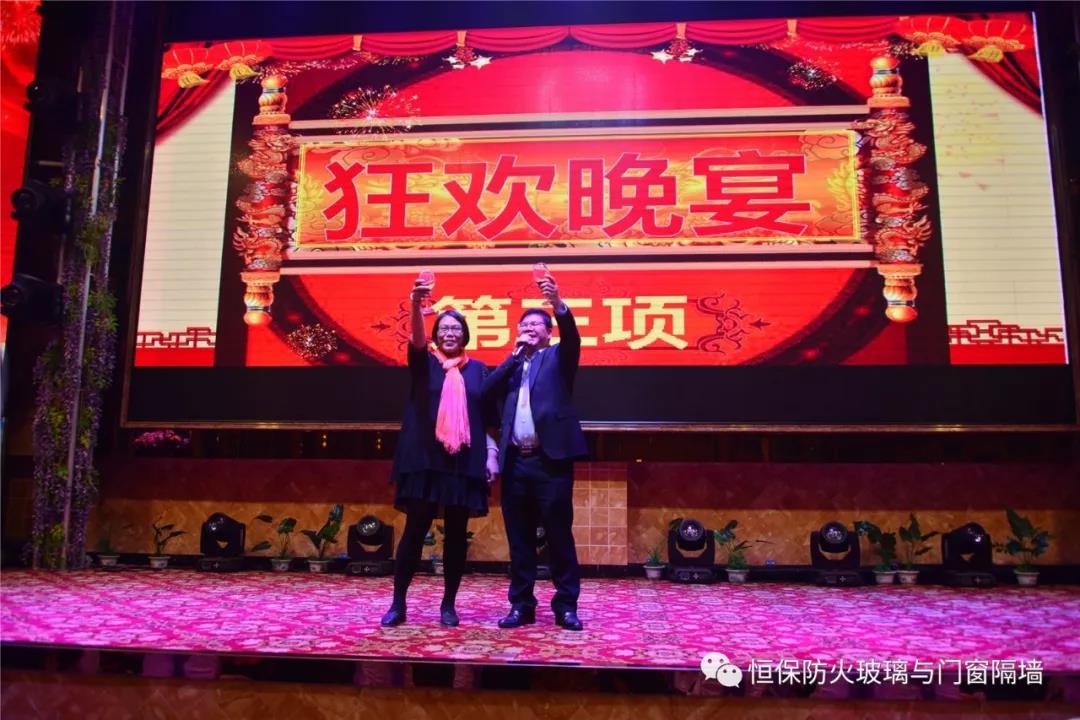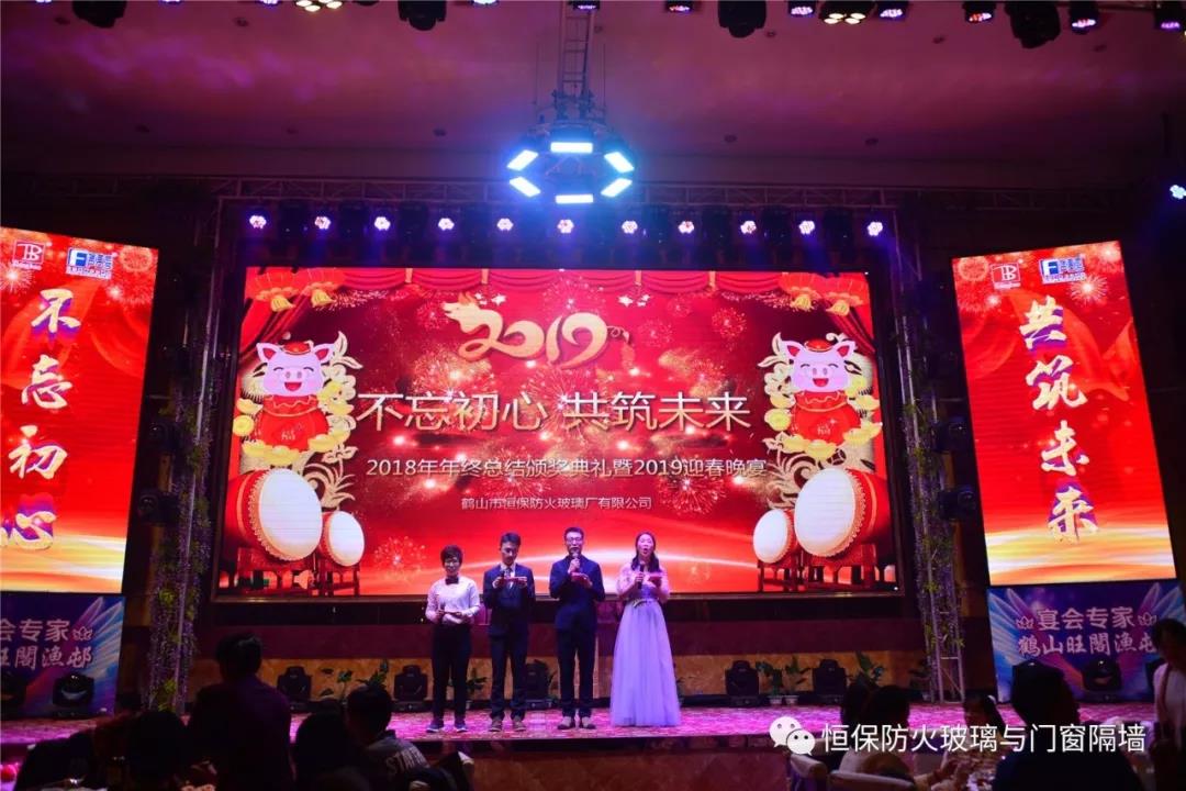19:30分,恒保年會在鼓舞飛揚中拉開了帷幕,首先是恒保總經理陳沃林先生做年終致辭,陳總回顧了2018年所取得的成績與不足,并提出了2019年恒保要全力以赴,不忘初心,繼續奮斗,再創佳績的戰略方針。2018年是恒保跨越發展的一年。全體恒保家人,團結一心,艱苦奮斗,全力實現了公司既定的年度目標,同比各項重要指標增長逾80%2018年我們大力引進新設備,開發新產品10多項,產品通過國家檢測20多項 ,至此,恒保出品已擁有373C認證,158份檢驗報告,成為行業內公認通過國家檢驗、認證最多的防火玻璃門窗企業;2018年在行業各類權威獎項評比中,榮獲“全國鋁門窗幕墻展 年度星品獎”、榮獲“新玻網 門窗玻璃十強企業”、陳沃林總經理榮獲鶴山市工商聯系統“工匠之星”稱號、陳沃林總經理榮獲第五屆中國玻璃行業“玻璃工匠”稱號、榮獲第三屆建筑門窗金軒獎“最具創新力配套產品”、榮獲第三屆建筑門窗金軒獎“最具發展潛力企業”、榮獲中國門窗幕墻行業“科技進步推動獎”等十多項獎項。2019年我們將持續優化各部門管理,提高員工工作技能、提高生產管理水平、提高生產效率、提高綜合管理能力,減少物料損耗,減少出錯率。加強精密型材、新型防火門窗的開發,滿足不同客戶的需求。2019年恒保上下一心、同心協力、不忘初心,共筑未來,為實現中國平安夢、世界平安夢繼續奮斗!