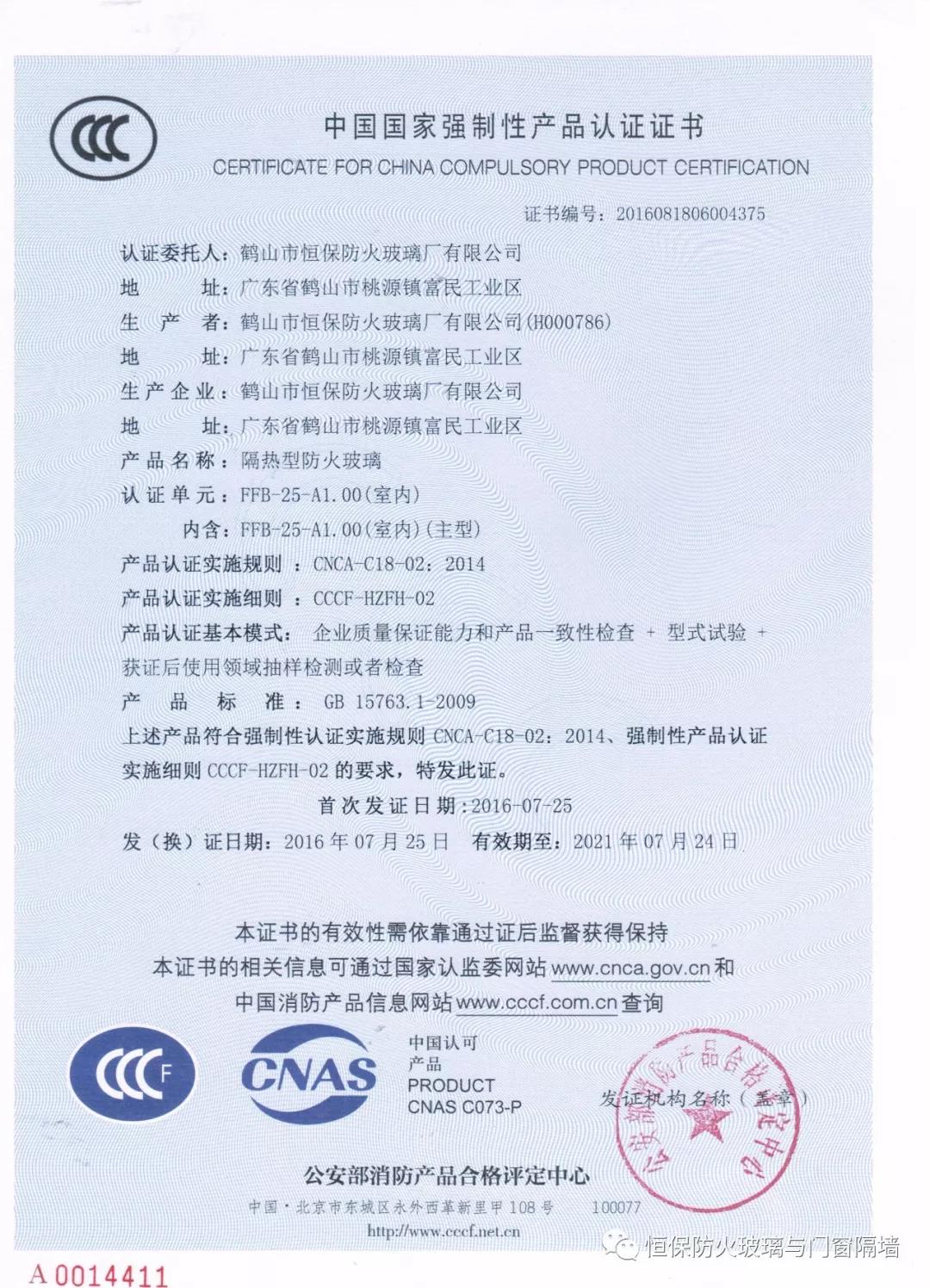 截至2017年7月,恒保已獲得國家“CCCf” 主型產品認證證書31張,評定中心網上公告報告51份,四川中心公告11份,英標、歐標、澳標、美標報告29份評估報告18份,耐火窗報告4份,共計113份涵蓋0.5小時至4小時防火玻璃系列產品,防火玻璃與門窗類專利17項。