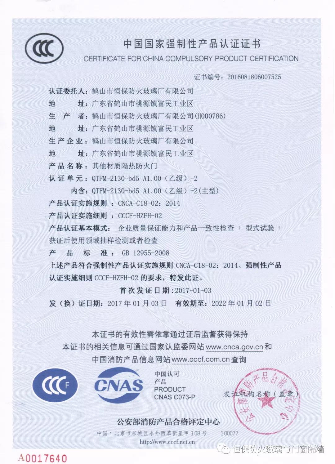 5、恒保公司一共6個產品獲得國家3C認證證書,其中大版面玻璃防火門2100mmX3000mm