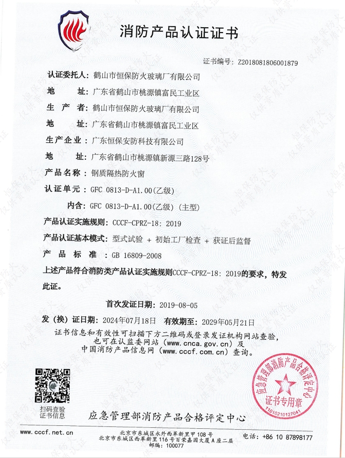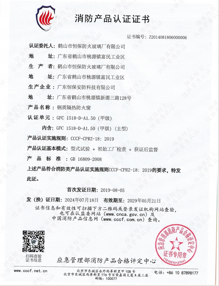 甲級(jí)固定防火窗消防產(chǎn)品認(rèn)證證書: