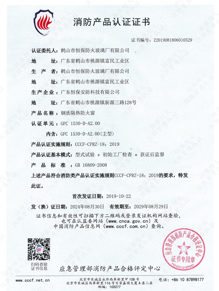 2.00H固定防火窗消防產(chǎn)品認(rèn)證證書: