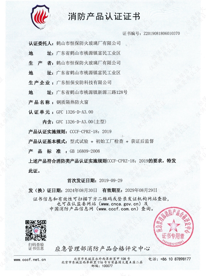3.00H固定防火窗消防產(chǎn)品認(rèn)證證書: